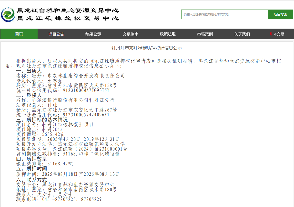黑龍江自然和生態(tài)資源交易中心辦理完成全省首宗龍江綠碳質(zhì)押貸款登記業(yè)務(wù),借貸雙方通過(guò)自然生態(tài)交易中心平臺(tái)實(shí)施龍江綠碳凍結(jié)功能,公示相關(guān)質(zhì)押信息,融資額1000萬(wàn)元,打通了以“碳匯+金融”盤(pán)活碳匯存量資產(chǎn)的新模式,進(jìn)一步拓寬了龍江綠碳價(jià)值實(shí)現(xiàn)渠道。