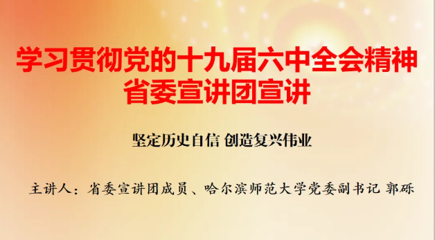 報(bào)告會(huì)上,省委宣講團(tuán)成員、哈爾濱師范大學(xué)黨委副書記郭礫以《堅(jiān)定歷史自信 創(chuàng)造復(fù)興偉業(yè)》為題,作了一場(chǎng)生動(dòng)精彩的宣講報(bào)告。報(bào)告從深入領(lǐng)會(huì)黨的十九屆六中全會(huì)精神的重大意義、深刻認(rèn)識(shí)全會(huì)精神的豐富內(nèi)涵與核心要義和準(zhǔn)確把握貫徹全會(huì)精神的實(shí)踐要求三個(gè)方面,對(duì)黨的十九屆六中全會(huì)精神進(jìn)行了系統(tǒng)闡釋和細(xì)致解讀。宣講報(bào)告主題鮮明、解讀精準(zhǔn),將全會(huì)精神與龍江實(shí)際結(jié)合緊密,具有很強(qiáng)的理論性和指導(dǎo)性。
