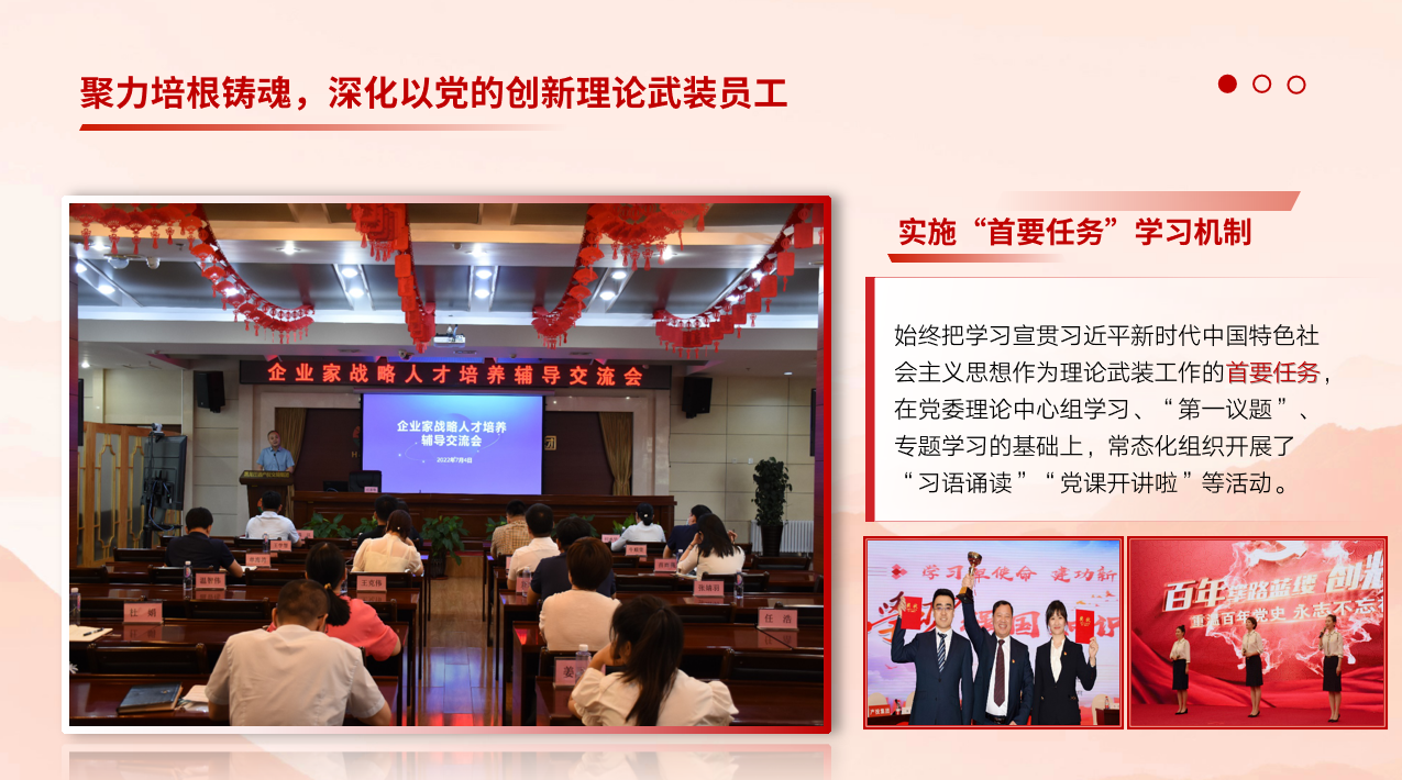 近年來,集團(tuán)黨委堅(jiān)持把思想政治工作作為一項(xiàng)經(jīng)常性、基礎(chǔ)性工作來抓,融入現(xiàn)代企業(yè)治理、經(jīng)營管理、企業(yè)文化建設(shè)、員工隊(duì)伍建設(shè),形成了全員、全程、全覆蓋的國有企業(yè)大思政模式,有效發(fā)揮了“生命線”的獨(dú)特作用,推動了企業(yè)高質(zhì)量發(fā)展。實(shí)施“首要任務(wù)”學(xué)習(xí)機(jī)制,實(shí)施核心價(jià)值培育機(jī)制,實(shí)施企業(yè)文化熔鑄機(jī)制,推動愛國主義、集體主義、社會主義教育深深融入員工血脈,厚培員工以企為家、愛企如家的歸屬感和凝聚力。