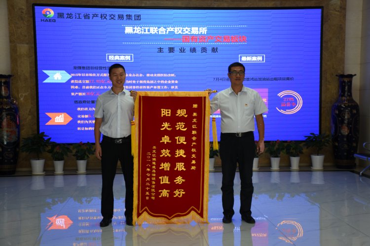 2018年8月23日,為表示對省產(chǎn)權(quán)交易集團(tuán)權(quán)屬企業(yè)黑龍江聯(lián)合產(chǎn)權(quán)交易所(以下簡稱“聯(lián)交所”)多年來在交易業(yè)務(wù)方面提供的優(yōu)質(zhì)服務(wù),特別是對哈爾濱市中山路鴻運(yùn)加油站出租項(xiàng)目的成功運(yùn)作表示誠摯感謝,省機(jī)關(guān)事務(wù)管理局所屬省直機(jī)關(guān)房屋物業(yè)管理中心(以下簡稱“物業(yè)管理中心”)副處長相國臣一行來到省產(chǎn)權(quán)交易集團(tuán),向省產(chǎn)權(quán)交易集團(tuán)和聯(lián)交所贈送了“增信增值增商譽(yù)、創(chuàng)新創(chuàng)優(yōu)創(chuàng)共贏”和“規(guī)范便捷服務(wù)好、陽光卓越增值高”的錦旗。
