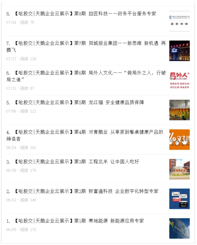 2020年,哈股交以“展示龍江企業(yè)風采,對接資本市場服務”為行動宗旨,在疫情期間推出“天鵝企業(yè)云展示”公益服務,助力企業(yè)復工復產(chǎn)。