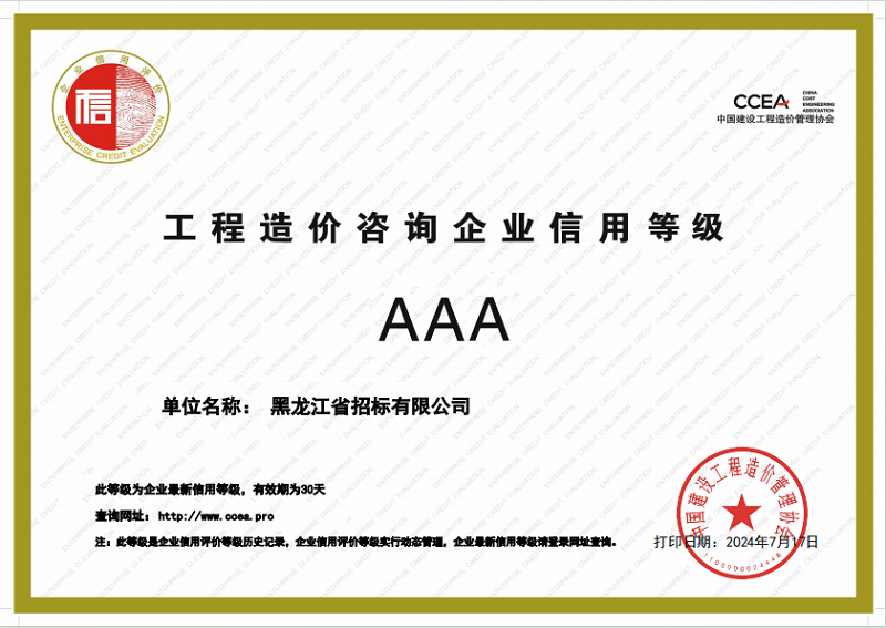 日前,中國(guó)建設(shè)工程造價(jià)管理協(xié)會(huì)發(fā)布了2024年第一批工程造價(jià)咨詢企業(yè)信用評(píng)價(jià)結(jié)果,黑龍江省招標(biāo)有限公司憑借專業(yè)的實(shí)力、優(yōu)質(zhì)的服務(wù)和良好的企業(yè)信譽(yù),榮獲了“工程造價(jià)咨詢企業(yè)AAA級(jí)”信用評(píng)價(jià)。