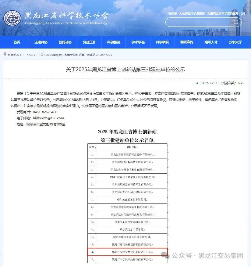 黑龍江省科學(xué)技術(shù)協(xié)會、黑龍江省工商業(yè)聯(lián)合會、共青團(tuán)黑龍江省委員會聯(lián)合發(fā)布通知,公布2025年黑龍江省博士創(chuàng)新站第三批建站單位名單。黑龍江股權(quán)交易中心憑借在服務(wù)科創(chuàng)企業(yè)、搭建資本橋梁、培育創(chuàng)新生態(tài)等領(lǐng)域的突出表現(xiàn),成功入選建站單位名單,這是對龍江股交在科技成果轉(zhuǎn)化、知識產(chǎn)權(quán)運(yùn)用、資本市場服務(wù)工作的權(quán)威認(rèn)可,更是對龍江股交助力“創(chuàng)新龍江”建設(shè)關(guān)鍵成效的充分肯定。